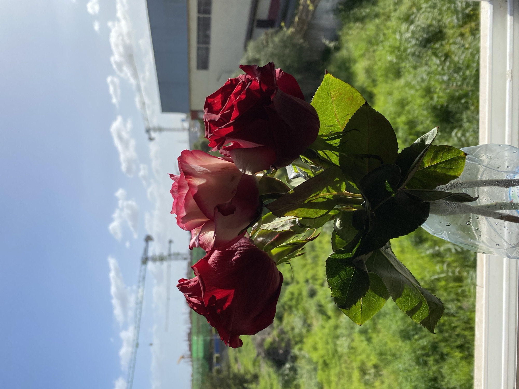 Three cut roses are arranged in a clear plastic bottle acting as a vase, positioned on a white windowsill