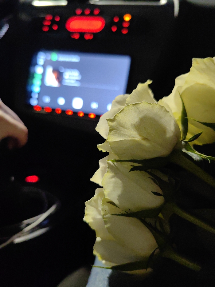 A low-light photograph captures a bundle of white or pale yellow roses positioned within the interior of a vehicle at night