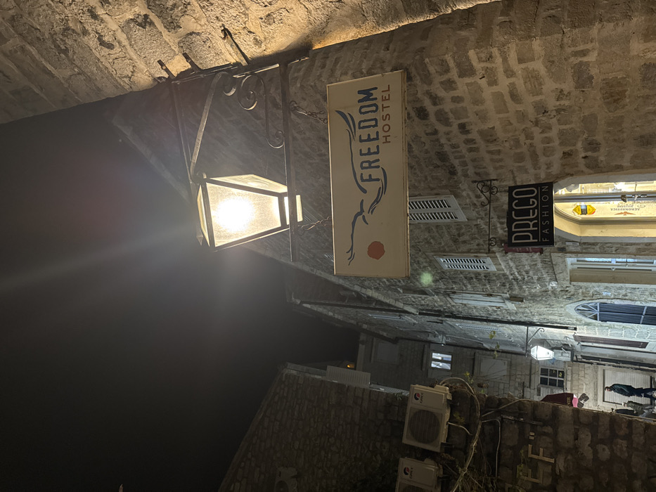 A sideways view captures a street at night. An ornate light fixture illuminates a 'Freedom Hostel' sign, followed by a 'Prego Fashion' sign. Stone buildings line the street, punctuated by windows and air conditioning units. The angle gives a perspective from below, looking up into the narrow street.