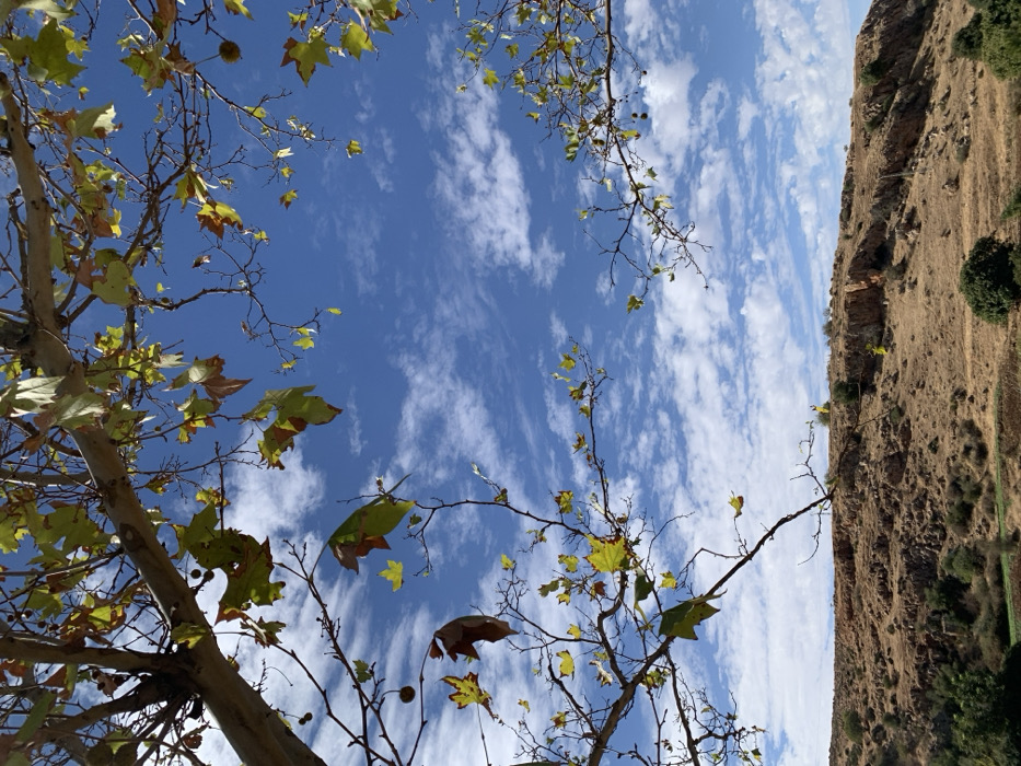 The image depicts an outdoor landscape in El Hajeb, Morocco, primarily composed of natural elements under a bright sky. The upper and lateral portions of the frame are occupied by the branches of a deciduous tree, likely a sycamore, with leaves displaying a range of colors from green to yellowish-brown, indicative of a seasonal change. Several spherical seed balls are attached to the branches. The central and upper background features a clear, deep blue sky with scattered, elongated white clouds. The lower half of the image presents a prominent, arid hill or plateau characterized by exposed rocky outcrops and sparse, yellowish-brown vegetation. At the base of the hill, some areas show denser, greener foliage. No individuals or specific actions are depicted.