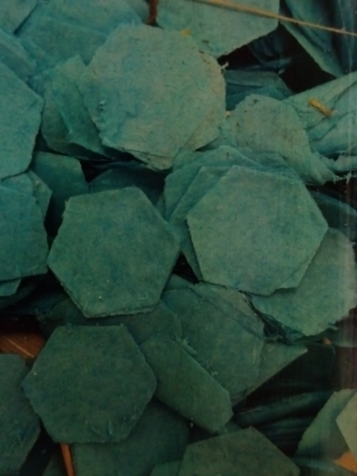 A close-up image displays a dense collection of numerous hexagonal-shaped objects. These objects, uniform in general shape but varying slightly in individual size and edge regularity, possess a textured, fibrous surface consistent with thick paper or felt, colored in a muted teal or blue-green hue. They are arranged in loose, overlapping piles, filling the majority of the frame, suggesting a bulk quantity contained within an unidentifiable container or spread across a surface. Some individual pieces exhibit minor surface imperfections, slight creasing, or fraying along their edges. No discernible individuals, specific actions, or interactions are visible. The environment appears to be an interior setting. This scene is located in the city of Leipzig, Germany.