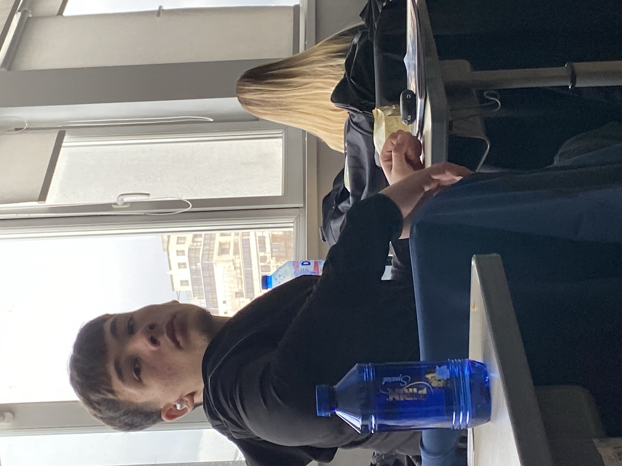 A medium, eye-level shot presents a scene within a building, likely an office or classroom setting, evidenced by the presence of desks, chairs, and windows. The primary subject is a young man with short, dark hair, appearing to be in his late teens or early twenties. He is wearing a dark-colored shirt. There are two bottles of "Pirin Special" water visible on the desk near him. Behind him, a woman with long, blond hair is seated, also in what looks like a work area. Through the large windows, a section of a city is visible with multi-story buildings, suggesting a location within an urban environment. Based on the architectural style and city layout visible through the window, and in conjunction with the brand of water present ("Pirin Special" being a Bulgarian brand), it is likely that this photo was taken in Bulgaria, possibly in the city of Varna. The visible buildings display a mix of architectural styles, ranging from older structures to modern constructions. The overall impression is a candid moment captured indoors, within an area that could be a school or office in an urban setting.