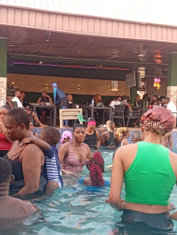 A group of people is enjoying a pool party. Several individuals are immersed in the water, some wearing swimsuits. One woman holds a child, while another wears a green tank top. In the background, under a covered area with a bar, people are seated at tables. A neon sign reading "Good Vibes Only" is visible in the background.