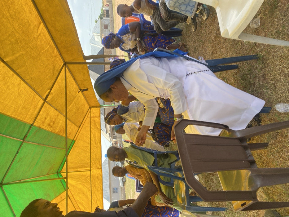 The image depicts an outdoor gathering in Itobe, Nigeria, taking place under a temporary tent structure featuring a green and yellow striped canopy. In the center, a Catholic nun, dressed in a white habit, blue veil, and a black rosary hanging from her waist, is seated on a blue plastic chair. She extends both hands forward, appearing to engage in an interaction with a male figure, only partially visible on the far left, wearing a dark shirt. The nun exhibits visible skin irregularities on her right cheek and wears a watch on her left wrist. To the left of the nun, two elderly men are seated on plastic chairs, one dressed in an orange-brown outfit and the other in a light green outfit. To the right of the nun, several women and a young boy are seated on various plastic chairs. One woman directly behind the nun wears a white top, a blue patterned skirt, and a matching headwrap. The ground beneath the tent is dry earth with sparse grass. In the background, outside the tent's perimeter, simple concrete block buildings with light-colored roofs are visible, along with a partial view of a white vehicle on the far left, all under a bright, partly cloudy sky.