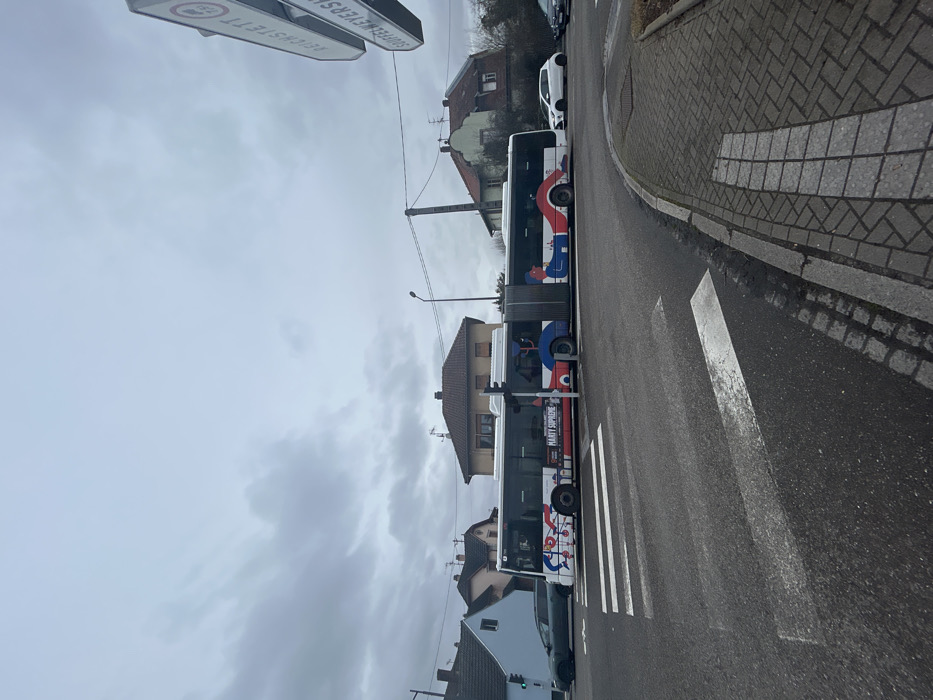 This image depicts a street scene at an intersection in Hoenheim, France, under an overcast sky