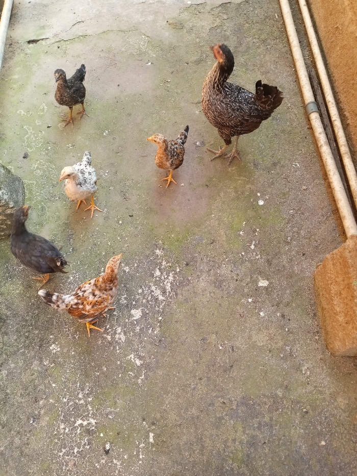 Six domestic chickens are observed on a mottled concrete surface in Sardauna, Nigeria