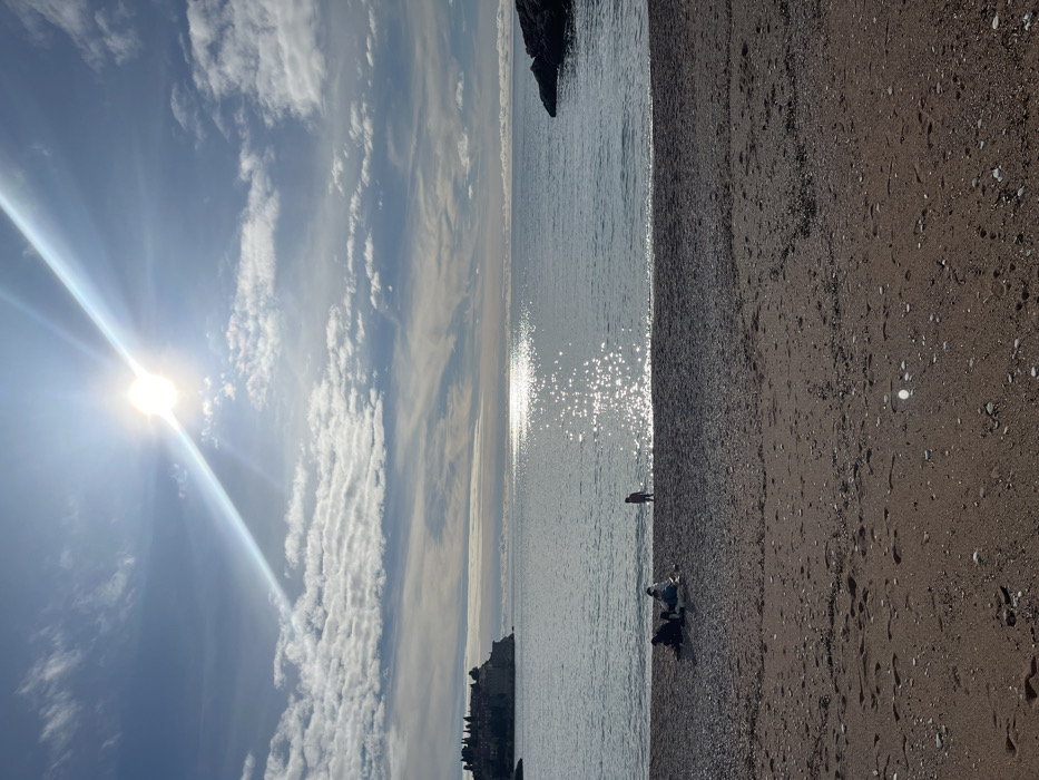 The image depicts a coastal scene on a sunny day, identified as Sveti Stefan, Montenegro. The foreground is a wide, light brown pebble beach with numerous footprints. Three individuals are seated or reclining on the left side of the beach. Further right, a single individual stands near the water's edge, facing the sea. The sea exhibits a pronounced path of direct sunlight reflection, glittering across its calm surface from the horizon towards the beach. In the distance on the left, the fortified island-village of Sveti Stefan is visible, characterized by its tightly packed buildings and vegetation on a rocky promontory. A dark rocky outcrop extends into the water on the far right. The sky is partially cloudy with blue patches, and a bright sun with a prominent lens flare is positioned high, slightly left of center, in the upper portion of the frame.