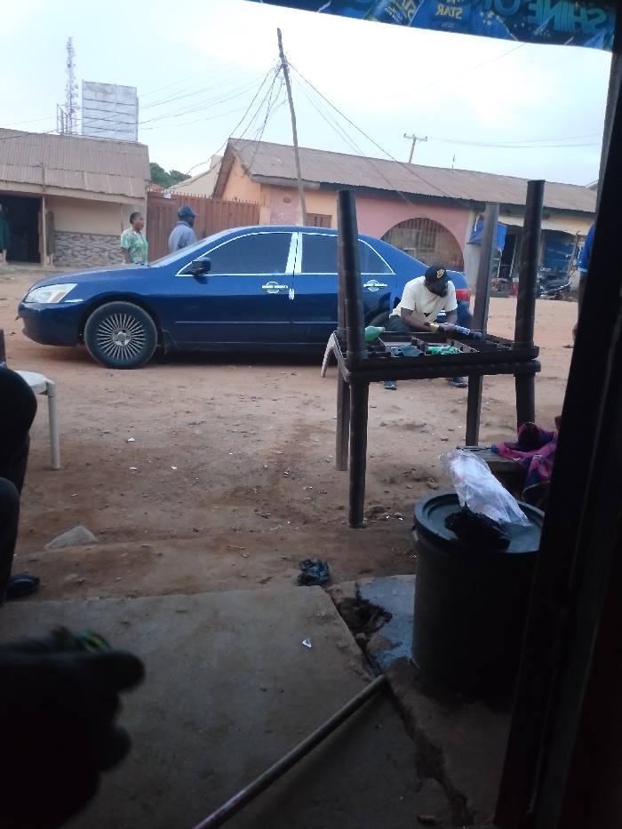 The scene, located in Narayi, Nigeria, is an outdoor area viewed from a partial interior vantage point. The ground is unpaved reddish-brown dirt. A dark blue sedan, consistent with a Honda Accord featuring custom silver multi-spoke wheel rims and tinted windows, is parked centrally on the dirt. Two individuals stand near its driver's side: a woman in a light-patterned top and dark trousers, and a man wearing a dark cap and dark top. To the right of the sedan, a man in a light-colored short-sleeved shirt and a dark baseball cap is seated on a plastic stool, leaning over a dark, four-legged table where he is actively engaged with tools or small objects. In the background, several single-story buildings with corrugated metal roofs are visible, including one with a light-colored stone base and another with an orange-brown facade featuring an arched opening. A communication tower stands in the far left background. Overhead utility lines crisscross the hazy sky, supported by wooden poles. A partial view of a person's dark hand is visible in the bottom left foreground, adjacent to a concrete ledge. A dark barrel topped with a clear plastic bag is in the bottom right foreground.