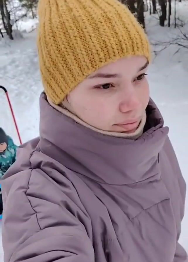 A young woman wearing a yellow knit hat and a quilted lavender-colored winter jacket is filmed from the chest up. She is surrounded by a snowy landscape with trees visible in the background. She appears to be pulling a sled, as a child is partly visible on the left of the frame. The woman’s face shows little expression as she looks around, seemingly focused on pulling the sled through the snow.