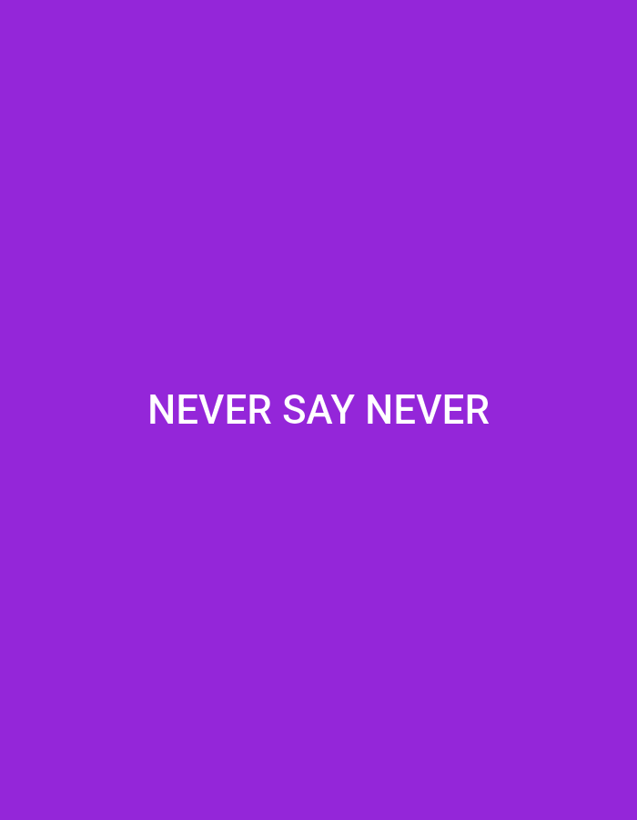 The image displays a static digital graphic. The entire background is a uniform, solid shade of purple. Centered horizontally and vertically on this background is white uppercase sans-serif text that reads "NEVER SAY NEVER". There are no discernible people, subjects, physical objects, actions, interactions, or environmental features within the image that would indicate a specific location, such as one within the city of Obosi, Nigeria. The scene consists solely of text on a monochrome background.