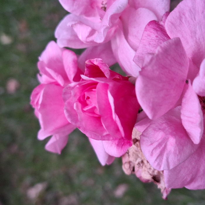 A cluster of pink flowers dominates the frame, featuring a variety of shades and textures
