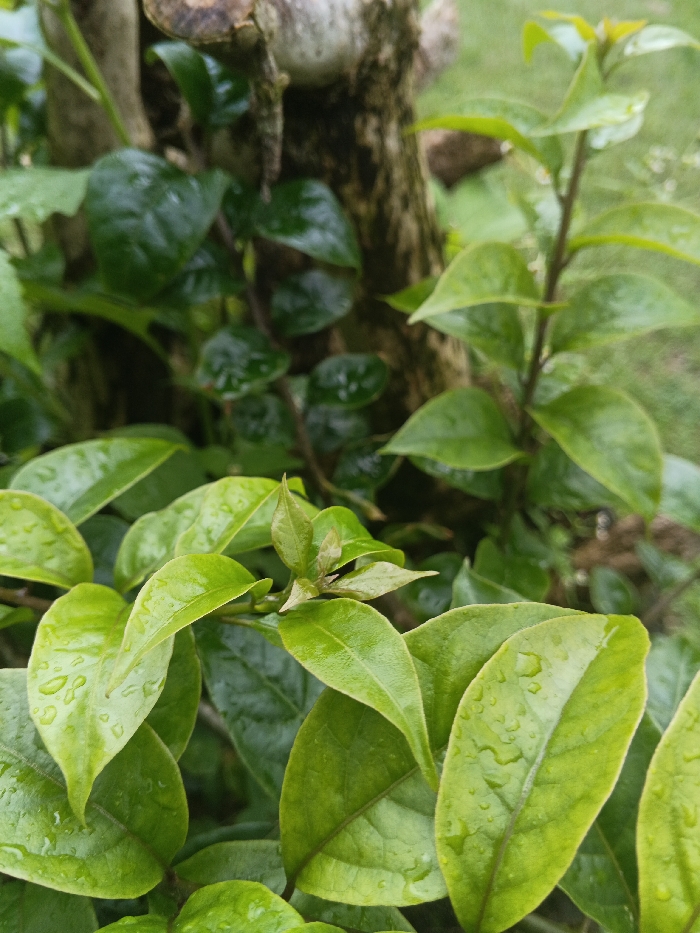 The image presents a close-up, ground-level view of vibrant green foliage in Keo Kouang, Laos. The foreground features numerous ovate leaves with pointed tips, displaying varying shades of green, from light chartreuse on newer growth at the center to darker emerald tones. Multiple leaves are visibly adorned with clear water droplets, indicating recent precipitation or dew. A segment of a tree trunk with rough, dark brown bark is partially visible in the blurred midground, surrounded by and partially obscured by additional dark green leaves. The background consists of an indistinct blur of green vegetation. No individuals, animals, or man-made structures are present within the frame. The scene is static, capturing a natural outdoor environment.