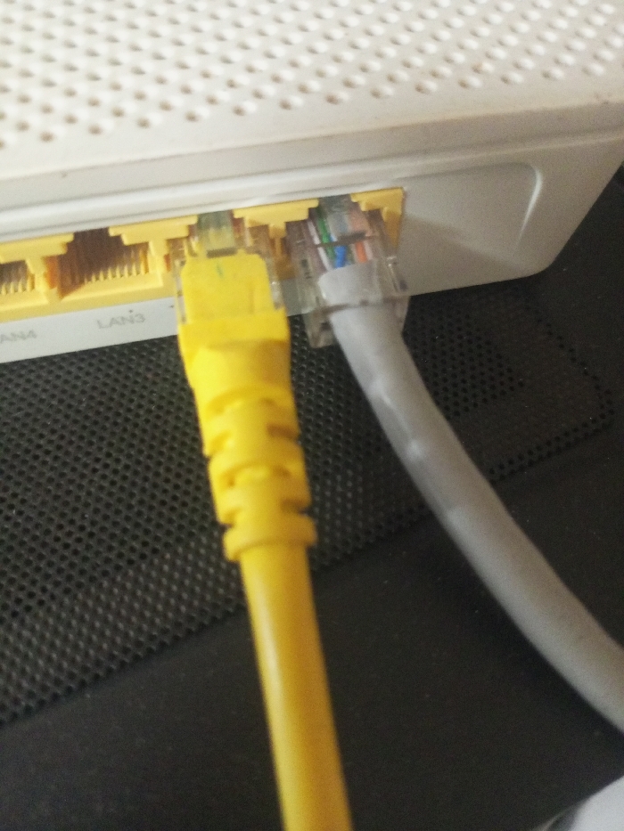 - "A close-up shot showcases the rear of a white electronic device, likely a router or modem, with two Ethernet cables plugged into its LAN ports" by FM-eUGlt2, licensed under CC BY 4.0
