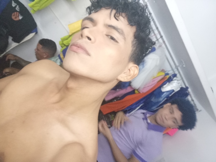A shirtless young man with dark, curly hair poses in front of the camera, head tilted, with a confident expression. Behind him, another person in a purple shirt reclines against a pile of colorful clothes. A third individual is partially visible in the background. The setting appears to be a closet or small room with assorted clothing items.