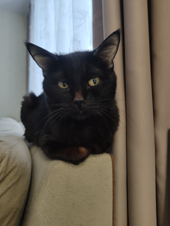 A black cat sits on a cream-colored sofa. The cat is positioned at the corner of the sofa, with its paws neatly folded. The cat has piercing yellow eyes, pointy ears, and numerous prominent whiskers. Soft white curtains are visible behind the cat and a thick, beige curtain is at the right. The cat has a dark nose and a small patch of brown fur is visible just below the chin. The cat's expression is a watchful, perhaps slightly grumpy, stare.