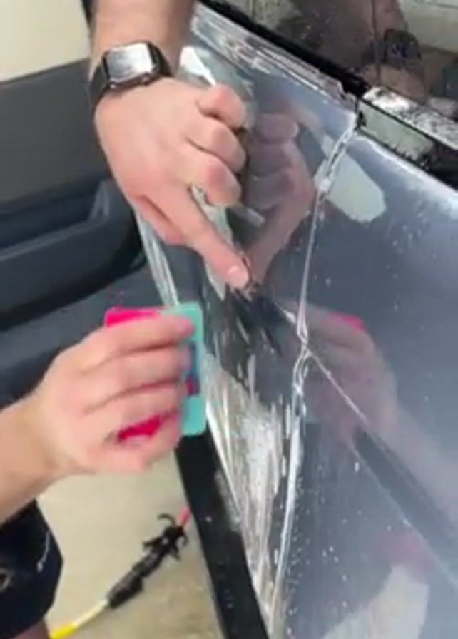 A man is applying a protective film to the side of a gray vehicle. The car door is open. The man wears a black polo shirt and a black watch on his left wrist. He's using two squeegees, one pink and one teal, to smooth the film onto the car surface. The car surface appears to be wet, possibly from a solution used to aid in the application of the film. A black hose attached to a yellow handle is visible on the bottom left of the shot. The environment appears to be an auto detailing shop.