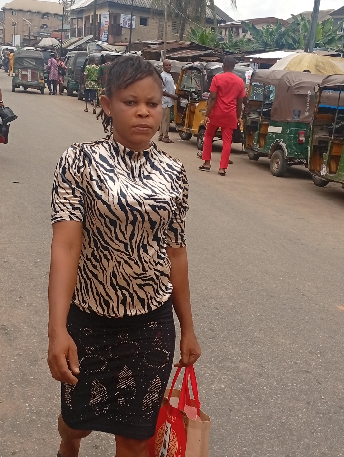 The image depicts a woman walking on an asphalt road in Umuode, Nigeria, during daylight hours