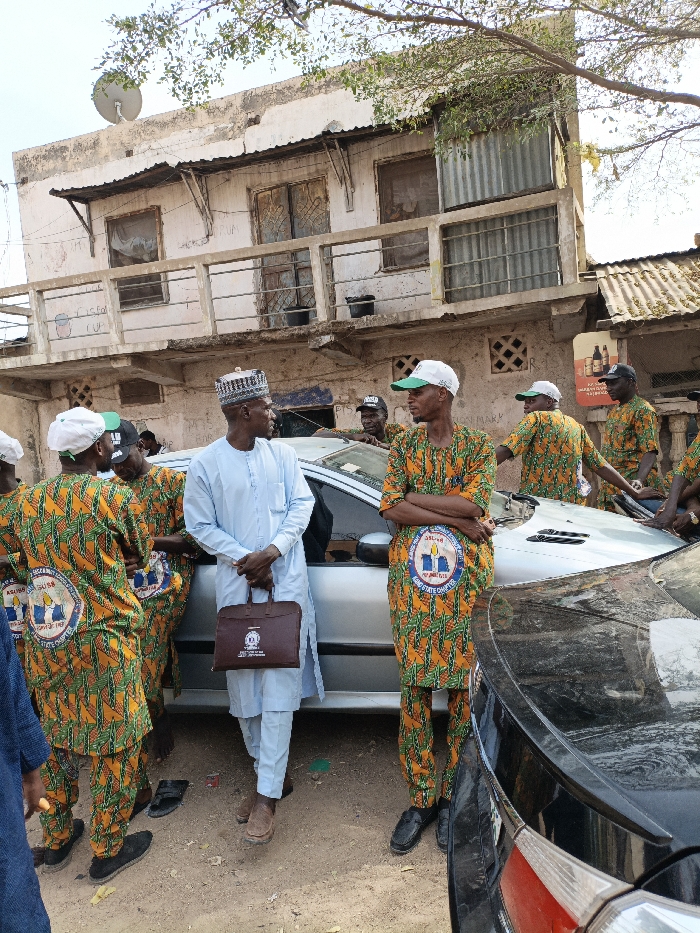 This image depicts a group of men gathered on an unpaved street in Gawuna, Nigeria, in front of a dilapidated two-story building. Approximately ten adult males are visible. A central figure wears a light blue traditional kaftan with a patterned cap and holds a brown leather briefcase bearing a crest. He stands facing right, appearing to converse with another man. This second man, to the right of the central figure, wears a matching green and orange patterned traditional top and trousers, a white and green baseball cap, and has his arms crossed. Several other men wear identical green and orange patterned attire; some have white and green caps, while others have black caps. The patterned attire features a circular emblem on the chest or upper leg, which reads "ASUU GUSSU" and "GUSSU STATE CHAPTER." Two cars are partially visible: a silver sedan behind the central figure and a black vehicle in the immediate foreground on the right. The men are standing around these vehicles, some appearing to lean against the silver car. The background building is an aged, off-white two-story structure with a flat roof featuring a satellite dish. It exhibits signs of wear, including peeling paint, visible cracking, and graffiti or markings on its walls. The second floor has a balcony with a simple metal railing and multiple windows, some covered with corrugated metal. Sparse tree branches are visible in the upper frame, suggesting an outdoor setting under a clear sky. The ground is dirt.