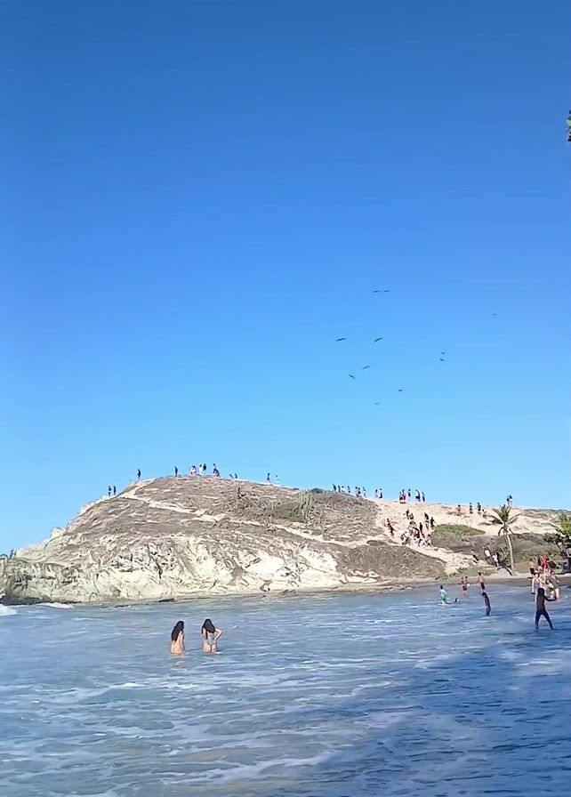beach scene on a sunny day. The sky is clear blue. There is a rocky hill to the left of the frame, covered with people walking and standing. A few people are swimming in the water near the hill. The water is clear and blue with foamy waves. Some trees are on the right side of the frame. Birds fly overhead. Several people stroll along the beach to the right of the frame.