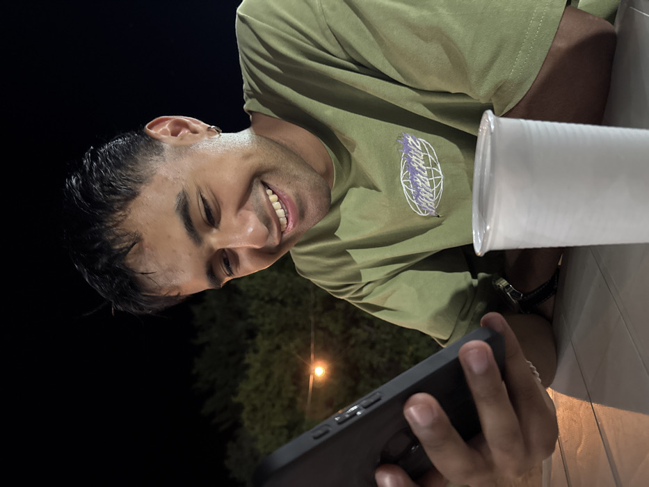 A person smiles while looking at their phone outdoors at night. They wear a green t-shirt with a white and purple logo. A white plastic cup sits on a nearby surface. A watch is visible on the wrist. Trees are slightly visible in the dark background with a light shining through.