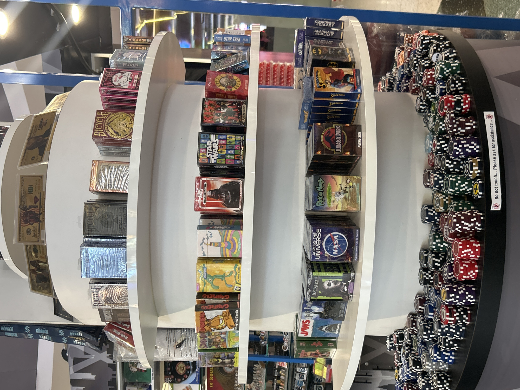 multi-tiered display stand in what appears to be a retail environment, likely a shop or store in Las Vegas, United States. The stand holds various decks of playing cards featuring licensed properties such as Star Wars, NASA, Jurassic Park, and Marvel Comics characters. Poker chips are displayed along the right side of the stand. A sign advises customers not to touch and to request assistance.
