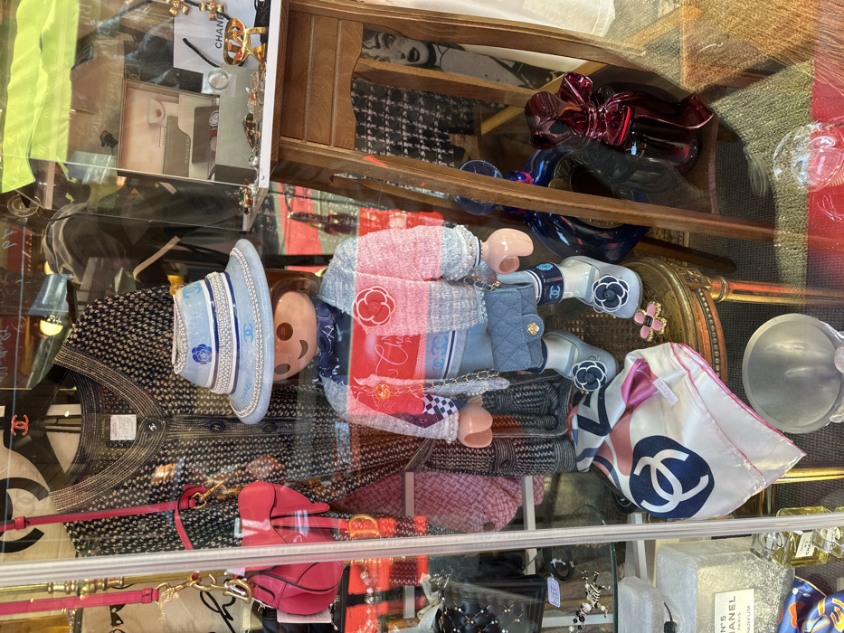 The image depicts a detailed retail store window display, located in Saint-Ouen-sur-Seine, France. A large, stylized mannequin, resembling a Playmobil figure with light skin, brown hair, and a smiling expression, is centrally positioned. The mannequin is adorned with luxury fashion items. It wears a light blue wide-brimmed hat embellished with silver-colored beaded chains and blue Chanel 'CC' logos. A patterned blue scarf is tied around its neck. Its attire includes a layered top: a light blue base garment with a dark blue 'CC' logo pattern, covered by a pink, white, and light blue tweed-style jacket. A red camellia-shaped brooch is pinned to the jacket's left chest, alongside a small gold heart pendant on a chain. Light blue quilted denim-style shorts or a skirt cover the lower body. A small, light blue quilted Chanel crossbody bag with a gold chain strap and 'CC' logo is held in the mannequin's right hand. Its feet wear light grey ballet flats featuring a black and white camellia flower on the toe, over white ankle coverings or socks branded with "Chanel" and a 'CC' logo. Behind the mannequin, a dark patterned Chanel cardigan, bearing a visible label and a red 'CC' brooch, hangs on a display. To the left, a pink quilted Dior saddle bag with a 'CD' charm is suspended. On the lower left, a white silk Chanel scarf with a prominent blue 'CC' logo and a pink border is folded on a gold, ornately carved stool. Chanel N°5 perfume bottles are also visible at the bottom. To the right of the mannequin, a multi-tiered light brown wooden display stand holds a white Bvlgari wallet, assorted jewelry pieces (rings, brooches, a gold 'CD' logo charm), and a white shopping bag with a black ribbon, likely from Dior. Below the stand, large, reflective blue and red sculptures, resembling balloon animals, are visible. A partially obscured black and white poster depicting Marilyn Monroe is visible in the background. Reflections on the clear glass of the display window indicate an exterior urban environment.
