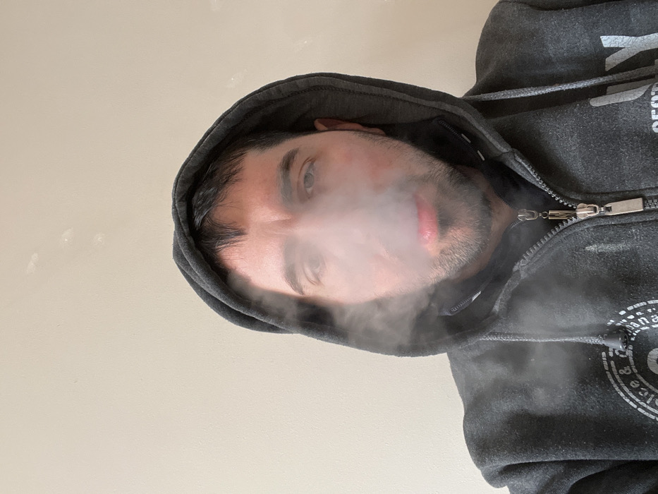 - "A male subject is depicted in a close-up, chest-level shot, looking directly at the camera while exhaling a cloud of white vapor from his mouth" by FM-dO5aw2, licensed under CC BY 4.0