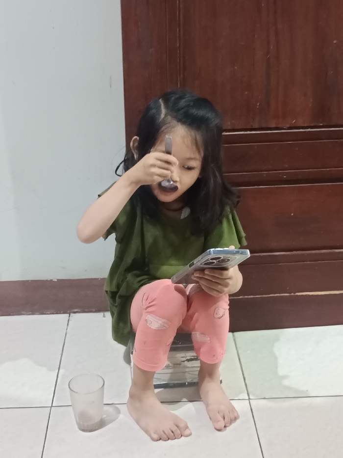 A young girl with dark hair sits barefoot on a stack of books, eating from a spoon while looking at a smartphone. She wears a green shirt and pink capri pants. A glass with a small amount of liquid sits to her left. The background consists of a white wall and a dark brown wooden door or paneling. The floor is tiled.