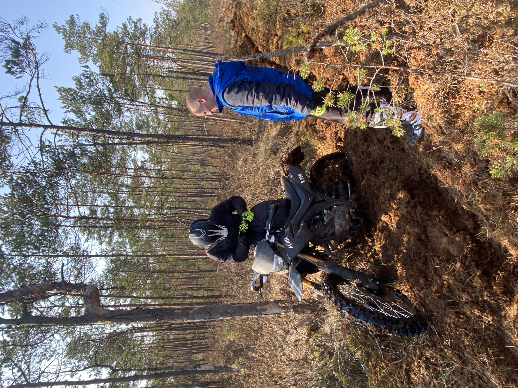 This image depicts an outdoor scene in a pine forest, specifically within the Парэцкі сельскі Савет, Belarus, under clear, bright daylight. Two adult males are present near a black "MINSK X 250" dirt bike that is partially embedded in dark brown, churned-up earth and peat. The individual on the left is wearing a black full-face motorcycle helmet with white accents, a black protective jacket, and bright green and black gloves, with "FOX" text visible on the left glove. This person is leaning over the stationary dirt bike, their hands near the handlebars. The motorcycle's front wheel is deeply mired in the muddy, disturbed ground. The second individual, positioned to the right of the motorcycle, is an adult male with short hair, wearing a blue hooded vest over a dark long-sleeved garment, dark pants, and white and black motocross boots that are visibly splattered with mud. He stands on a slightly elevated area of disturbed ground, looking towards the first individual or the motorcycle. The environment consists of numerous tall, slender pine trees with green canopies, under a clear blue sky. The ground is characterized by extensive areas of dark brown, wet, and excavated peat or mud, with a distinct trench-like track running horizontally in the mid-ground to the right. Patches of reddish-brown moss or low vegetation are present. Several small pine saplings are visible in the immediate foreground on the right. One prominent pine tree in the left foreground exhibits a distinct, twisted section in its trunk.