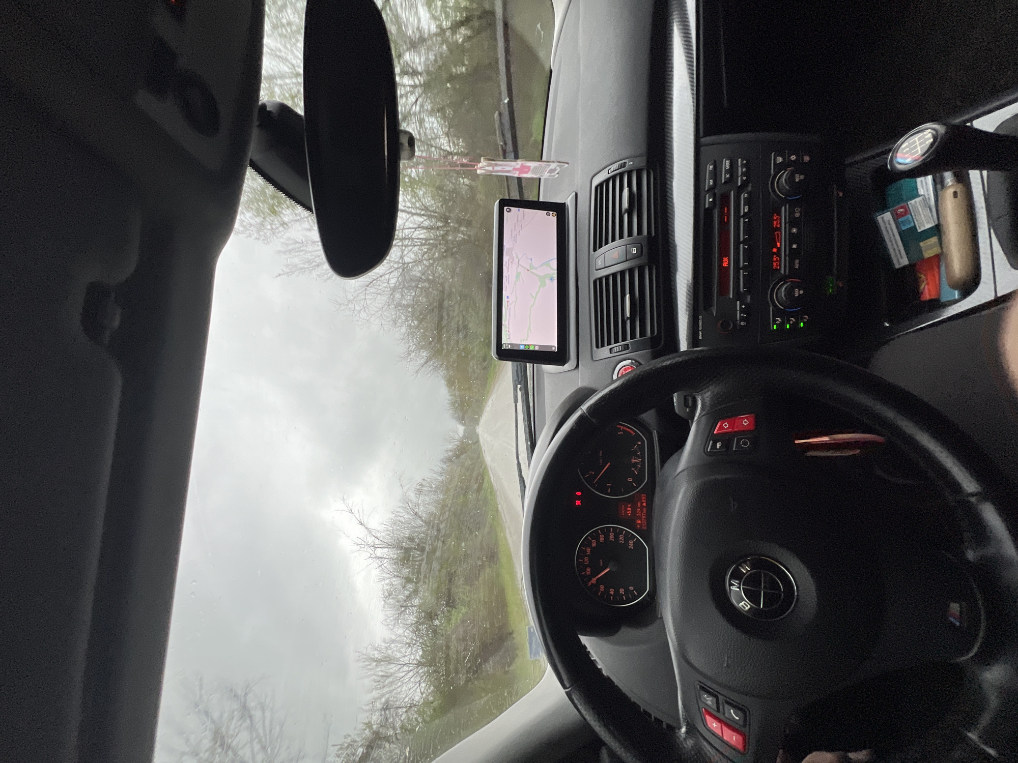 The view is from inside a BMW car, focused on the dashboard and the road ahead. A GPS device displaying a map is mounted on the dashboard. The car's speedometer and other gauges are visible behind the steering wheel. The radio and various controls are positioned to the right of the GPS. Through the windshield, a rainy road and surrounding trees are seen. Based on the road conditions and the fact that the GPS is mounted on the car, the car is moving. There is no information in the image that confirms this photo was taken in the city of Lyaskovets, Bulgaria. The location information is not available from the image.