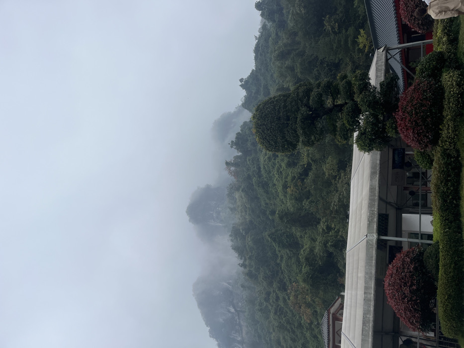 Fog shrouds lush green mountains in this overcast scene. A building with a white, angled roofline is visible, surrounded by carefully manicured greenery, including round bushes and hedges. A tall, pruned tree stands near the building, adding to the structured landscape. The misty conditions soften the mountain peaks and obscure some of the details of the dense vegetation.