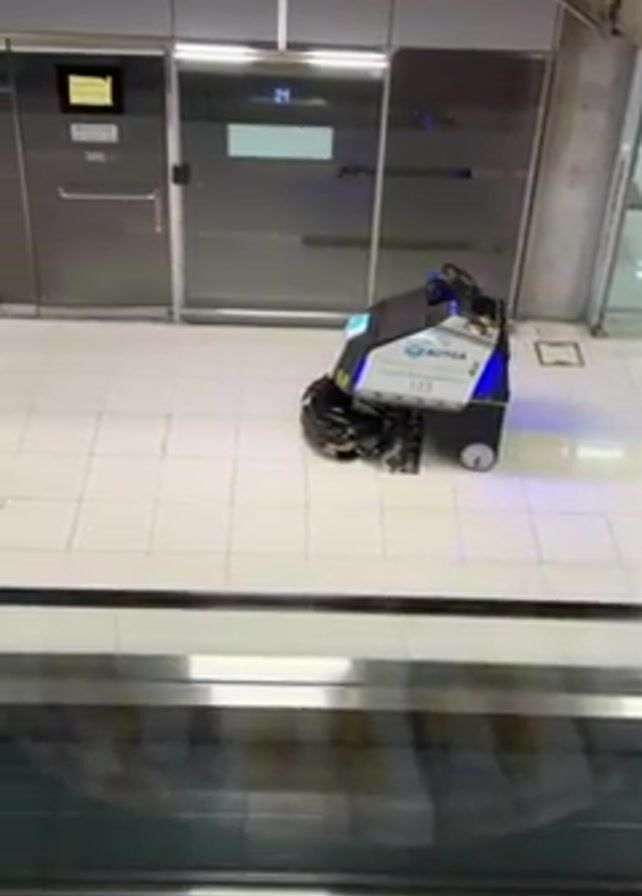 n automated floor cleaning machine in an airport or similar facility