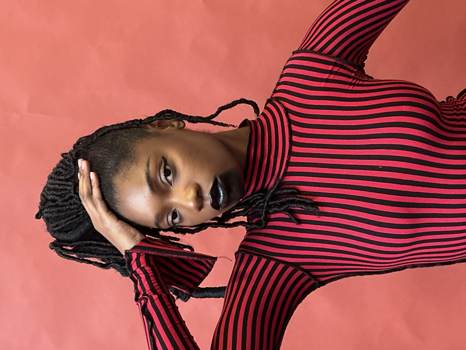 A woman with dark skin and braided hair poses against a solid salmon backdrop. She wears a form-fitting long-sleeved shirt with horizontal red and black stripes. Her makeup includes dark eyeliner and glossy black lipstick. Her left hand is raised to her head in a thoughtful pose, and she gazes directly at the viewer with a slight tilt of her head. The photograph is oriented at an angle, and the lighting is soft and even.