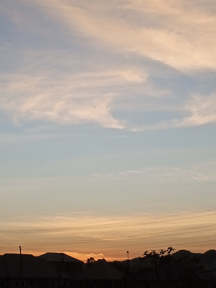 The image captures a tranquil sunset scene. Wispy, white clouds float in the upper portion of the sky, tinged with a faint orange hue. Beneath them is a broad expanse of pale blue. Closer to the horizon, the sky transitions to a warmer orange and yellow gradient. Silhouettes of rooftops, trees, and possibly hills are visible at the bottom of the frame. Power lines stretch across the lower portion, adding to the residential landscape.