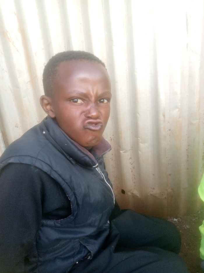 A person with dark skin, short hair, and a puffy face makes an angry expression with squinted eyes and pursed lips. They wear a black shirt and a sleeveless puffy vest. The background features a corrugated metal wall with vertical ridges. Part of a bright green object is visible on the right side of the image. The lighting is bright but somewhat diffused, resulting in visible shadows and highlights on the person's face.
