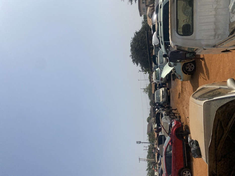 This image depicts an outdoor automobile junkyard or repair facility in Nyanya, Nigeria, under a clear, bright blue sky