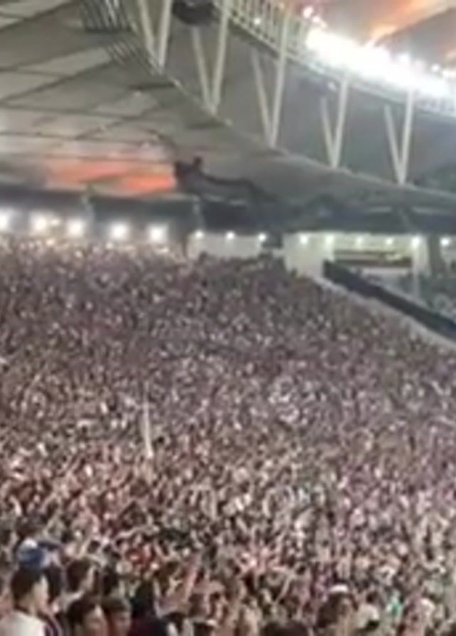 large crowd of people in a stadium. The crowd is dense and fills a large portion of the seating area. People are mostly standing, and some are waving their arms or cheering. The stadium has a modern design with a high, curved roof. Bright lights illuminate the scene. A large screen is visible in the distance, showing a feed of the event occurring on the field.