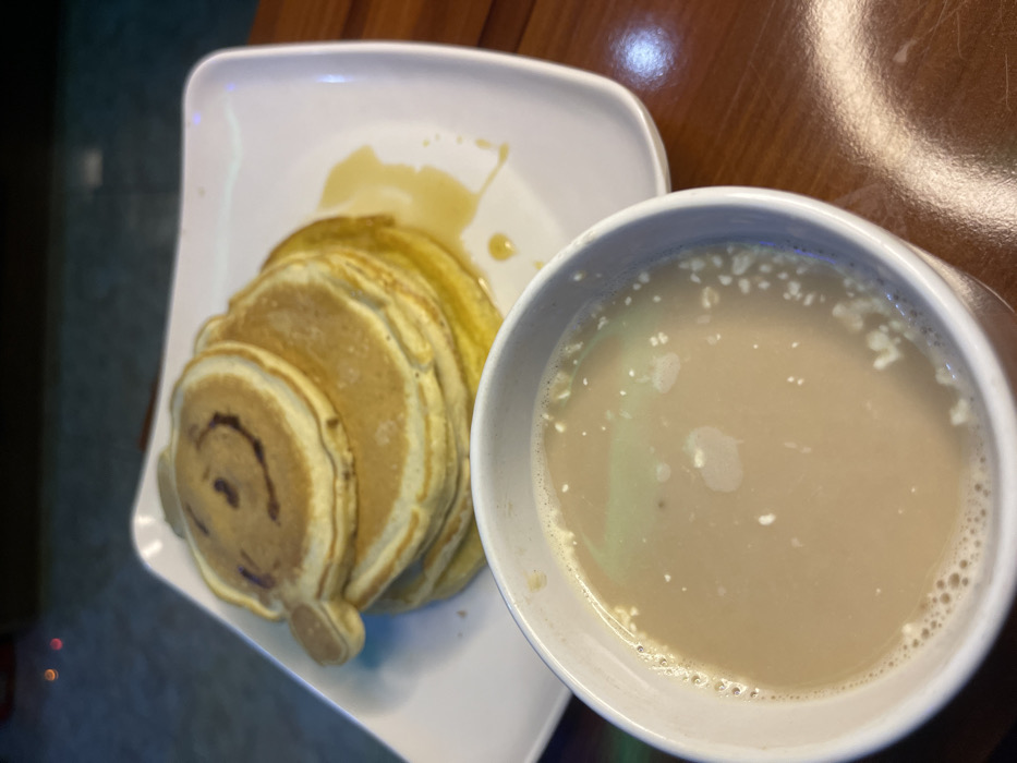 A close-up view depicts a breakfast setting on a reddish-brown wooden table. In the immediate foreground, a white ceramic mug contains an opaque, light brown liquid, likely coffee or tea with milk, exhibiting a greenish tint in a central swirl and small white particles on its surface and adhering to the rim. Positioned behind the mug, a stack of approximately seven golden-brown pancakes rests on a white rectangular plate. The uppermost pancake features a dark, concentric swirl design. A smaller, distinct pancake, shaped like a miniature frying pan with a handle, is positioned on the left side of the main stack. Golden-colored syrup or honey is drizzled over the pancakes and has collected in a small pool on the white plate. The background is blurred, showing out-of-focus lights, indicative of an indoor environment. The specific location within Jos, Nigeria, is not identifiable from the image content.