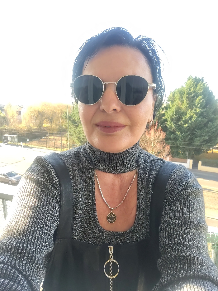 A selfie photograph depicts a middle-aged female subject positioned outdoors in the city of Ostwald, France. The subject has dark, short hair and wears round, silver-framed sunglasses with dark lenses, and light pink lipstick. Her attire consists of a grey, metallic-sheen, ribbed mock-neck sweater with a cutout below the neck, overlaid with a black, leather-like garment featuring a central silver zipper with a large circular pull ring. A silver chain necklace with a circular pendant, displaying a black center and a gold cross-like symbol, is worn. A silver earring is visible on her right ear. The background indicates an elevated outdoor location, possibly a balcony, with a metal railing partially visible in the lower left. Beyond the railing, an urban or suburban landscape is visible under a clear sky. Features in the background include a road or parking area with a light-colored vehicle, deciduous trees in various states of foliage loss, a distant building, and a large evergreen tree on the right.