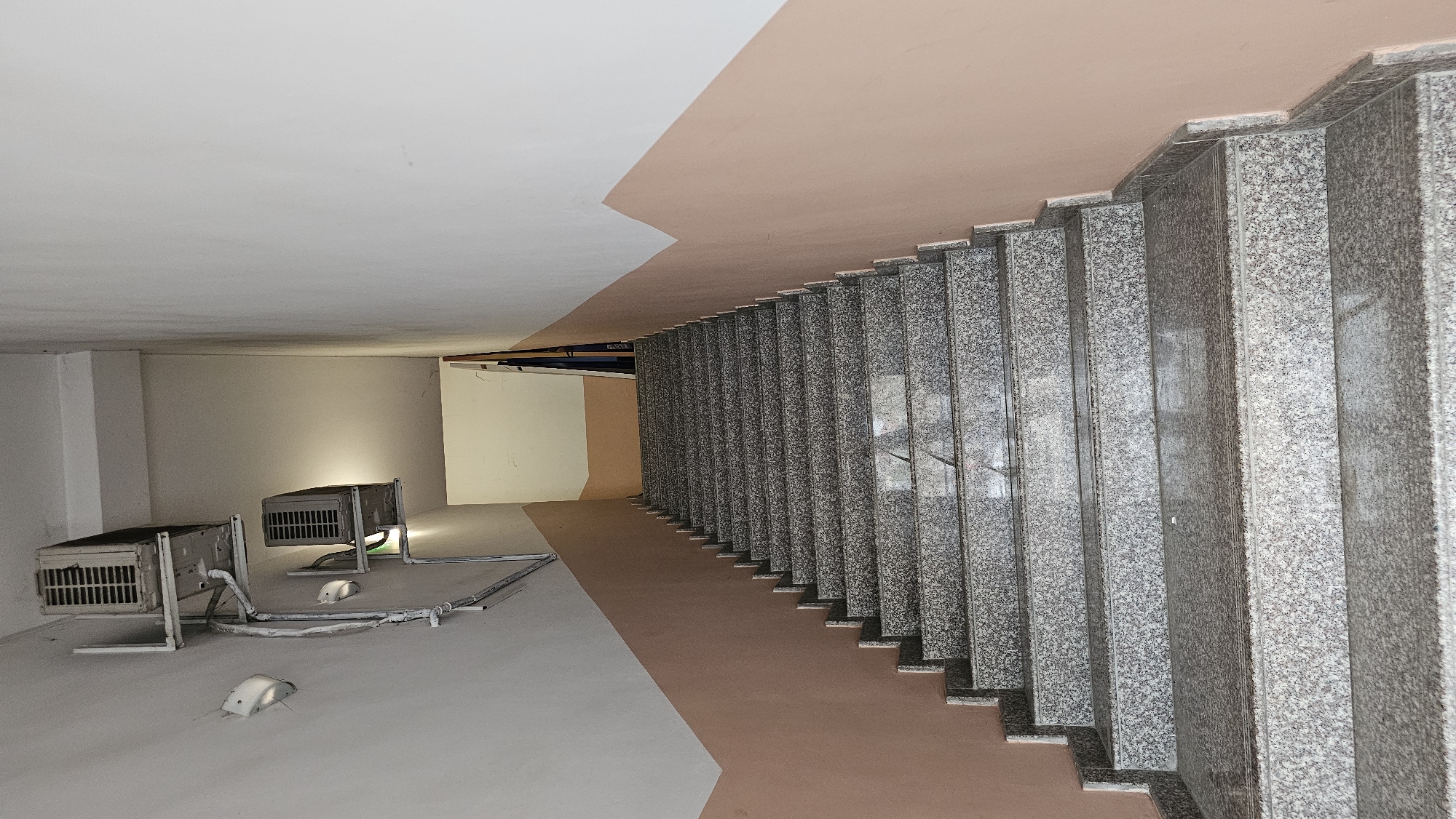 A stairwell with a white ceiling and a salmon-colored accent section running along the stairs is pictured. The stairs themselves are made of speckled gray stone. On the left side of the image, there are two industrial-looking air conditioning units or ventilation systems mounted on the wall. The room is somewhat industrial in appearance, with exposed pipes and equipment. The location in the city of Karlovo, Bulgaria is not evident in the image.