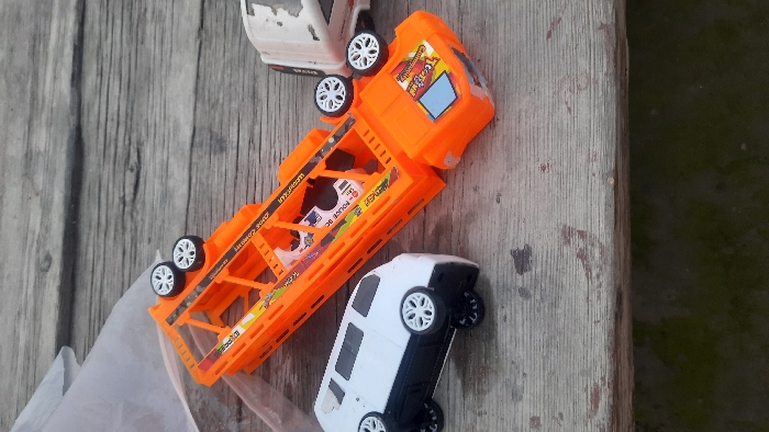 - "An orange toy car carrier truck with several small white and black toy cars is angled on weathered wood planks" by FM-PQtpd2, licensed under CC BY 4.0