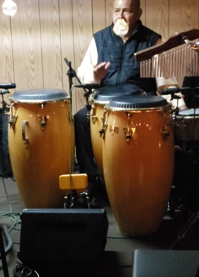 A man is playing two conga drums while standing in front of a wood-paneled wall. He is wearing a light-colored long-sleeved shirt and a dark vest. He is holding a striker in his right hand and using it to play a chimes instrument. The drums are a light tan color. There is a speaker on either side of the drums. The lighting is dim.