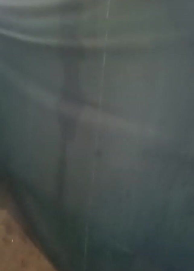 The camera pans downward inside a shelter or tent-like structure. The top part of the tent is white and the walls are a dark green. The ground is covered with dirt and some debris. There is an opening in the structure where light is visible.