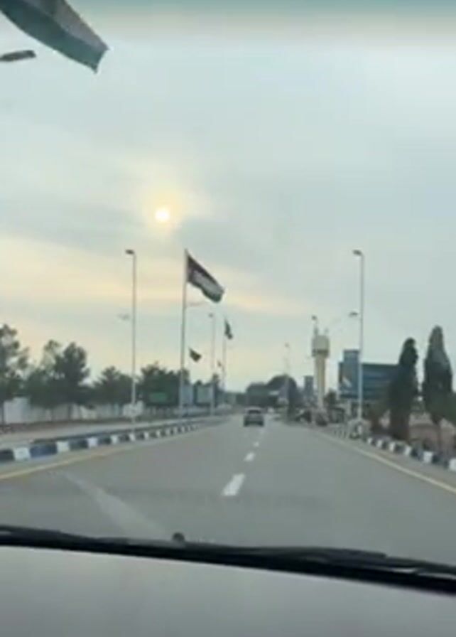 car's perspective driving down a road lined with flagpoles. The flags include those of India, Jordan, and France. The road is paved, with white lane markings and blue and white curbs. Streetlights line the road, and there is some greenery visible. The sky is overcast, and the sun is visible as a bright circle behind the clouds. There is a single car in the distance ahead. A billboard is visible to the right of the road. The dashboard of the car is visible at the bottom of the frame. Music plays in the background.