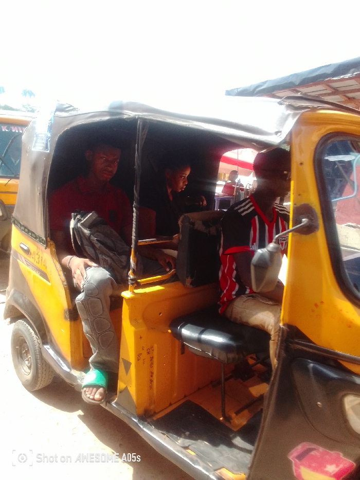 The scene is set in Egbagu, Nigeria, depicting an outdoor, bright daylight environment. The primary subject is a yellow and black three-wheeled auto-rickshaw, commonly known as a Keke Napep, viewed from its open right side. Three male individuals are seated within the vehicle. In the rear passenger compartment, on the left, a male with dark complexion wears a red short-sleeved polo shirt, grey pants with textured knee areas, and green slides on his feet. He is seated with a dark bag or object resting on his lap and looks directly towards the camera. Behind him, another male, also with dark complexion and wearing a dark shirt, is partially visible, looking towards the right side of the frame. In the front driver's position, a third male with dark complexion wears a black, red, and white striped short-sleeved shirt (displaying a "São Paulo FC" logo), light-colored trousers, and appears to have short hair and dark sunglasses. He is seated, facing partially to the right. The auto-rickshaw's exterior is predominantly yellow with a black canopy and black seating. A number "4314" is visible on the yellow bodywork, and handwritten markings are present on the interior panel, including "CK 3900 3900 500". A black side mirror is attached to the right side of the driver's area. The ground beneath the vehicle appears to be dry, unpaved earth. In the distant background, another yellow vehicle is partially visible on the left, and a red canopy or awning is seen on the right.
