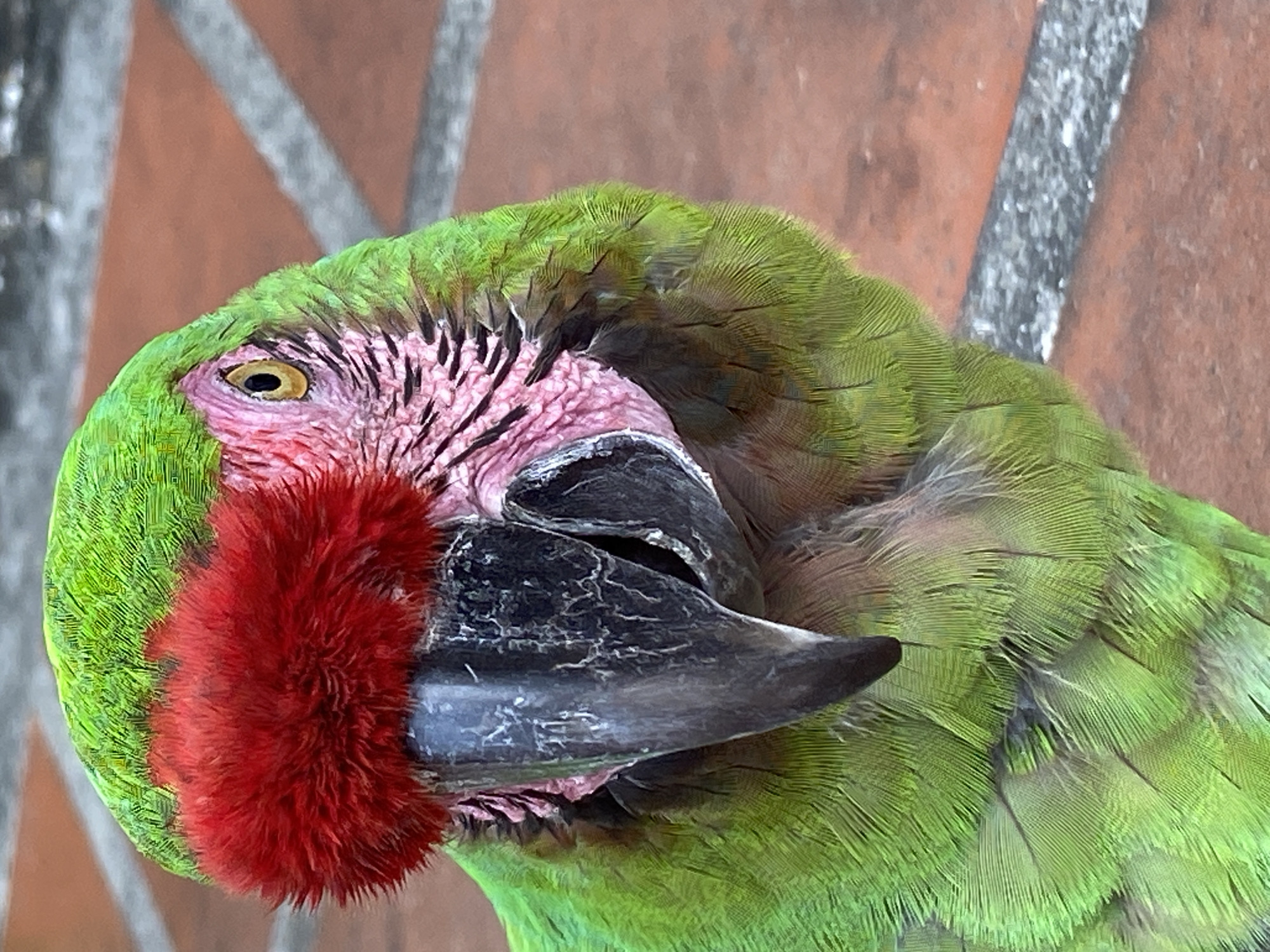 An avian subject, likely a large parrot, is depicted in a close-up, eye-level shot. The bird exhibits predominantly bright green plumage across its body and the upper rear of its head. A distinct, dense patch of fluffy, bright red feathers covers its forehead. The area around its right eye and extending towards the beak is composed of bare pink skin, marked with fine black linear feather patterns. The eye itself features a yellow iris and a central black pupil. The beak is large, robust, and dark gray in color, displaying a curved upper mandible with visible texture and surface imperfections. The bird's head is angled slightly to the viewer's left, with its right eye directed towards the camera. The background consists of an out-of-focus paved surface, characterized by rectangular reddish-brown tiles separated by gray grout lines. The scene is illuminated by natural light. The specific location is San José de Barlovento, Venezuela.