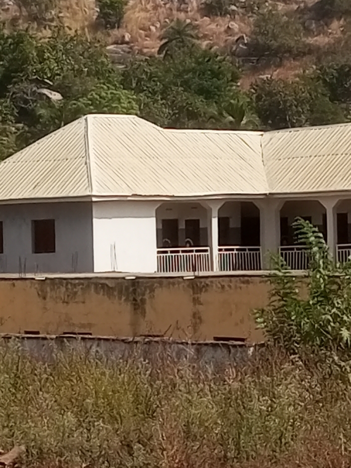 A building with a light-colored, ridged roof and white walls, partially obscured by overgrown vegetation. The building has a veranda with visible supporting columns and railings. It sits atop a low wall, which appears weathered or stained. A hillside covered in trees and shrubs forms the backdrop. The foreground is dominated by the dense growth of tall grasses and bushes, adding a sense of untamed nature encroaching on the built environment.