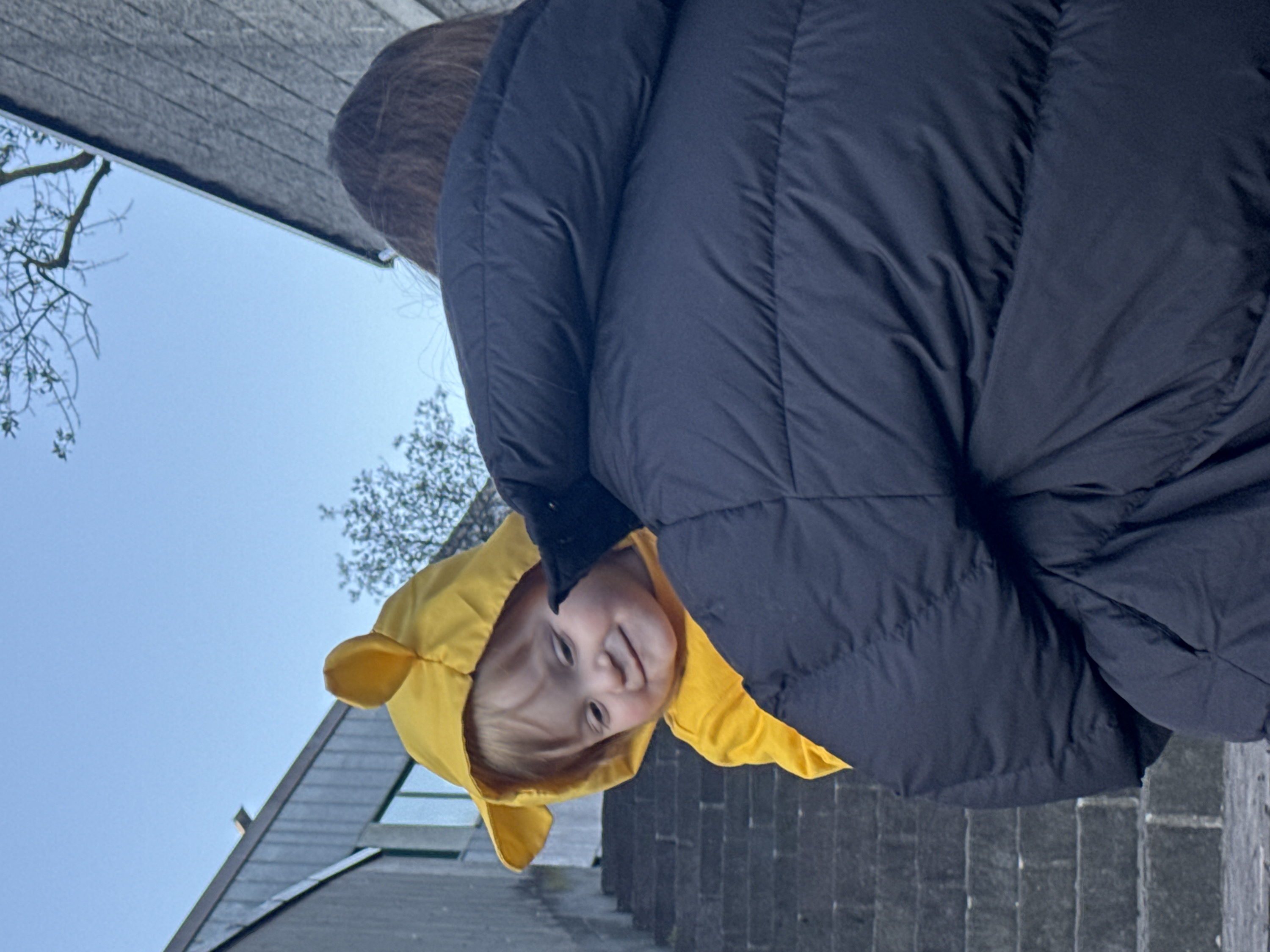 A young child wearing a yellow hooded jacket with bear ears looks directly at the camera. An adult in a dark puffy coat stands behind the child, obscuring part of the view. The sky is light blue, and a bare tree branch is visible in the background. Part of a building with gray roof shingles is also visible. The photo appears to be taken from a low angle.
