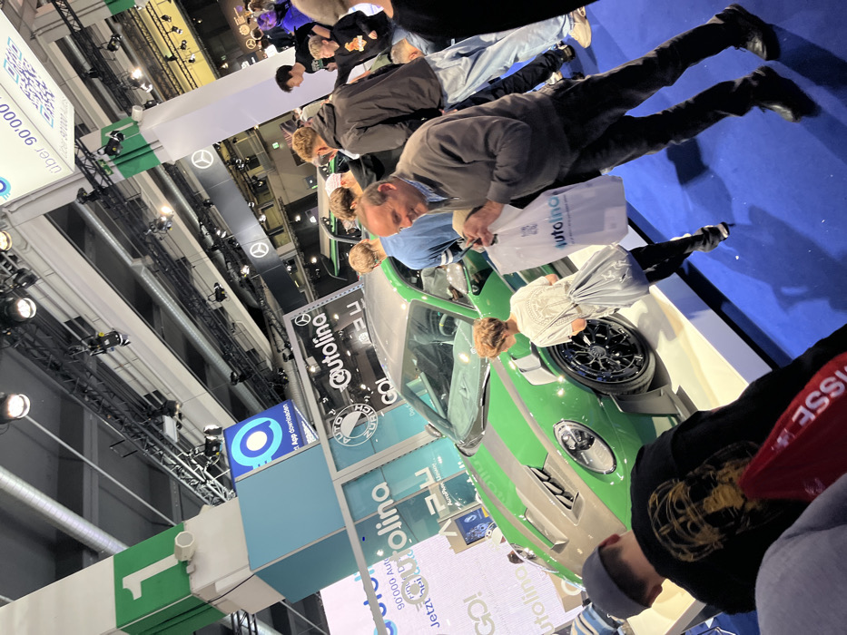 An indoor exhibition hall in Zurich, Switzerland, likely the "Auto Zürich" show, is depicted