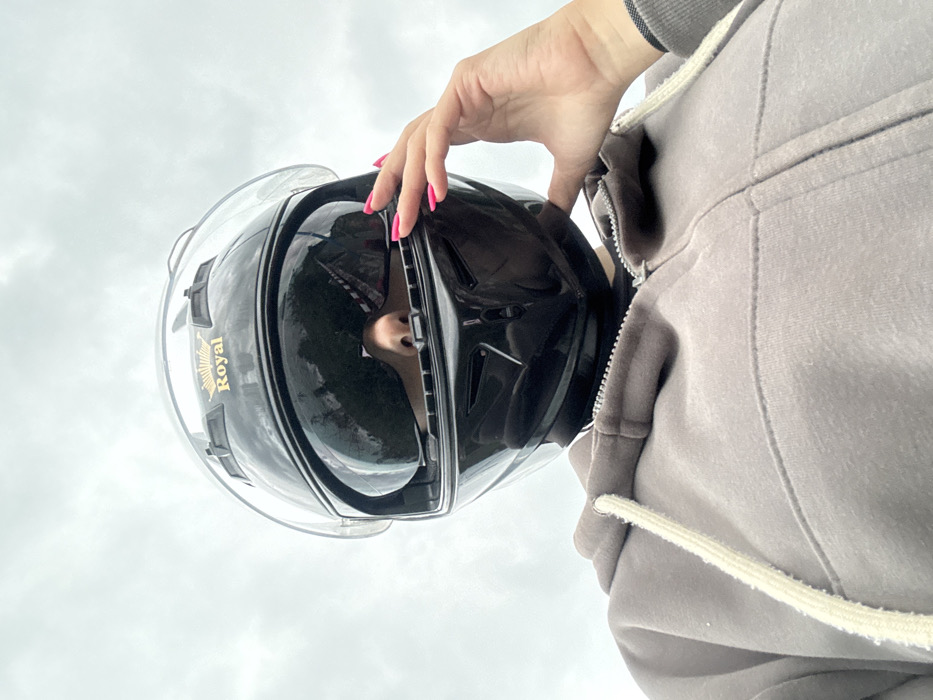 An upward-angled photograph depicts an individual outdoors in Vĩnh Lương, Vietnam, under an overcast sky. The subject is partially visible from the chest upwards, wearing a black full-face motorcycle helmet. The helmet features a gold "Royal" brand logo with a crown on its forehead, a clear outer visor, and a dark inner visor that is slightly lifted, revealing the subject's nose. The subject's left hand, with bright pink painted fingernails, is positioned with fingers touching the lower front portion of the helmet. The individual is also wearing a grey hooded sweatshirt with a zippered front and a light-colored drawstring. The dark visor reflects indistinct environmental elements, possibly trees or structures.